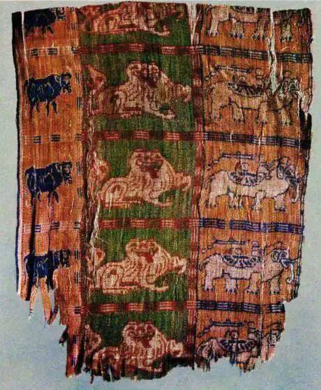 织锦最引人注目的,是方格内栩栩如生的三种神兽——牛:中原农耕文明的象征,代表勤劳与富足;狮子:随佛教与西域文化传入,象征威严与力量;大象:联系南亚与佛教艺术,寓意吉祥与庄严。三种文化符号共织一锦,展现了北朝时期对东西方元素的包容与整合,成为丝路文明对话的“微型剧场”。