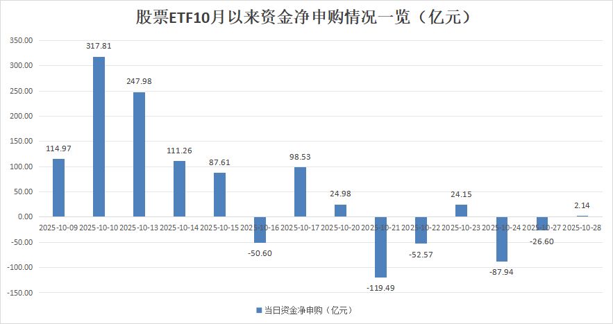 时隔十年,上证指数冲击4000点。具有“逆市风向标”之称的股票ETF整体加仓意愿减弱,据银河证券基金研究中心数据统计海陆证券,10月28日,股票ETF市场(含跨境ETF)全天净流入仅2亿元出头。